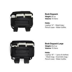 A mochila Book Daypack Large é caracterizada por seu tamanho espaçoso, perfeita para carregar tecnologia maior. É cortada em tecido PU à prova d'água, projetada para repelir a chuva. A mochila Book Daypack Large é limpa, sempre contemporânea e à prova d'água. O design elegante mantém espaço para tudo com um grande compartimento principal que inclui um bolso acolchoado para laptop. Um bolso frontal com zíper oferece espaço de armazenamento para itens essenciais menores com fácil acesso. A mochila Book Daypack Large possui uma alça de transporte na parte superior, painel de malha respirável na parte de trás e alças traseiras ajustáveis para conforto. O bolso acolchoado cabe em um laptop de 16 polegadas, tornando este design à prova d'água um item básico perfeito para usar na bicicleta ou a pé. O design é cortado do tecido PU à prova d'água característico da Rains, projetado para resistência ao transporte, durabilidade e uma sensação suave.