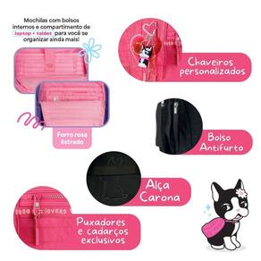 A mochila de costas Rebecca Bonbon RB27006 é a escolha perfeita para quem busca praticidade com muito estilo. Disponível em quatro cores incríveis - preto, rosa, lilás e verde -, é confeccionada em nylon de alta qualidade com matelassê localizado em formato de estrelas e corações, e traz um charme extra com cadarço acetinado logado e forro interno rosa listrado. O compartimento principal é amplo e conta com divisórias acolchoadas especiais para notebook e tablet, garantindo segurança e organização. Além disso, possui três compartimentos frontais com fechamento por zíper, sendo um deles com divisórias internas, além de bolsos laterais telados duplos ideais para garrafinhas. Para completar, acompanha chaveiro pompom de coração, mascote em 3D, medalhinha de metal, cadarço exclusivo e até uma cartela de adesivos personalizados. O conforto fica por conta das alças acolchoadas ajustáveis, e a praticidade é garantida pela alça de mão superior e alça carona para acoplar em malas. Um detalhe extra de segurança é o bolso antifurto localizado na parte traseira da mochila. Todos os puxadores de zíperes são personalizados. Dimensões aproximadas: 44x33x14cm. Marca: Não Informado