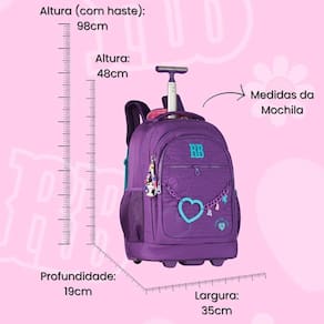 Mochila Rebecca Bonbon De Rodinhas Juvenil Escolar Mala Teen - Clio Style A Mochila Rebecca Bonbon é perfeita para meninas que buscam praticidade e estilo. Feita com materiais de alta qualidade, essa mochila de rodas é resistente e espaçosa, ideal para carregar livros, cadernos e outros itens escolares. Possui compartimentos bem organizados, alças convenientes e acolchoadas para maior conforto, além de um design moderno e delicado, com detalhes que encantam. Características Mochila: Alça de mão e costas Bolsos laterais telados Bolso interno para lápis e caneta Chaveiro e corrente personalizado Mascote em 3D Forro rosa logado Puxador personalizado Zíper tratorado Cadarço acetinado logado Placa de metal colorida Proteção para asas e rodas Especificações Mochila: Marca: Clio Style Medidas Aproximadas Mochila A x L x P : 48cm x 35cm x 19cm Altura com a haste levantada: 98cm Aprox Peso: 2.022kg Aprox Capacidade: 31L Composição do produto: Poliéster Polegadas: 19 Compartimento para Notebook: 15 Conteúdo da Embalagem: Rb27009 - 1 Mochila de Rodas Rebeca Bonbon As cores podem variar entre as imagens mostradas acima e o produto. Imagens meramente ilustrativas. Todas as informações divulgadas são de responsabilidade exclusiva do fabricante. de 90 dias contra defeito de fabricação. Marca: Não Informado Ean: 7896403984640