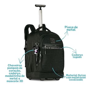 A mochila conta com rodinhas resistentes, alça retrátil e estampa delicada da personagem.