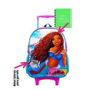 A mochila de rodas possui um design encantador, com estampa estilizada da Sereia Ariel. Produzida em poliéster resistente, ela conta com uma divisão grande e dois bolsos laterais em redinha, ideais para armazenar garrafas e outros itens pequenos. Além disso, a mochila possui alça de carrinho com duas rodinhas e zíperes com puxadores personalizados, garantindo facilidade no transporte e segurança dos objetos.