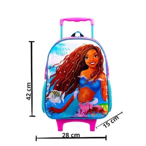 A mochila de rodas possui um design encantador, com estampa estilizada da Sereia Ariel. Produzida em poliéster resistente, ela conta com uma divisão grande e dois bolsos laterais em redinha, ideais para armazenar garrafas e outros itens pequenos. Além disso, a mochila possui alça de carrinho com duas rodinhas e zíperes com puxadores personalizados, garantindo facilidade no transporte e segurança dos objetos.