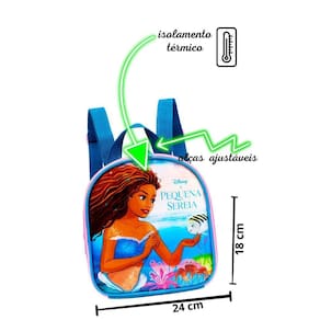 A lancheira térmica também possui a estampa da Sereia Ariel e é produzida em poliéster resistente. Com alças de costas, ela é prática e fácil de carregar. Seu material interno é térmico, mantendo as refeições frescas por mais tempo. Os zíperes com puxadores personalizados garantem praticidade e segurança no fechamento da lancheira. Vale ressaltar que o conjunto não acompanha potinho e garrafinha.