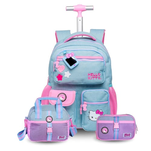O combo perfeito para quem ama praticidade, estilo e fofura! A mochila de rodas Hello Kitty jeans vem com puxador em alumínio, alças acolchoadas, compartimentos espaçosos e detalhes encantadores. A lancheira térmica mantém os lanches sempre fresquinhos e pode ser usada nas costas ou na transversal. O estojo box completa o kit com muito charme e organização, com espaço ideal para lápis, canetas e acessórios. Tudo isso com acabamento em jeans, forro personalizado e aplicação da personagem mais amada!