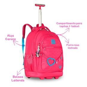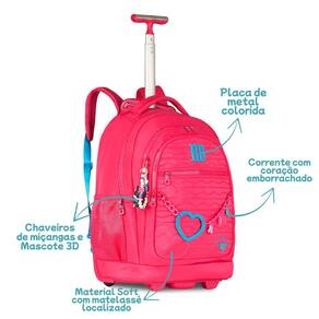 Características Mochila: - Alça de mão - Alça de Costas - Bolsos Laterias - Confeccionados em material nylon com Matelassê - Chaveiros de pompom de coração, cadarço, medalinha de metal e mascote 3D - Logo RB em metal - Proteção para rodas e alças - Zíper tratorado com puxadores com cadarço - Compartimentos para laptop + tablet- Forro rossa listrado