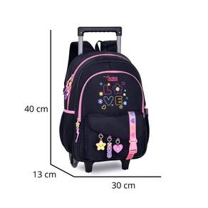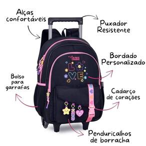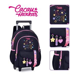A mochila de carrinho da coleção Cacau Haxkar é aquele modelo que conquista à primeira vista, cheia de estilo, personalidade e detalhes que fazem toda a diferença no dia a dia escolar. Confeccionada em poliéster soft, traz acabamento caprichado com logo bordado, cadarços acetinados e puxadores de metal com corda, além de pingentes emborrachados super charmosos que deixam a peça ainda mais divertida e atual. Seu compartimento principal é amplo e ideal para acomodar livros, cadernos e pastas com facilidade. Na parte frontal, a mochila conta com um compartimento espaçoso com divisórias internas que ajudam na organização, além de um bolso adicional de fácil acesso. Os bolsos telados nas laterais são perfeitos para garrafinhas ou pequenos objetos, garantindo praticidade durante a rotina escolar. O sistema de carrinho facilita o transporte, oferecendo mais conforto para crianças e tranquilidade para os pais. Dimensões aproximadas: 40 x 30 x 13 cm. Marca: Não Informado Ean: 7793965749444
