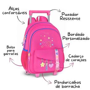 A mochila de carrinho da coleção Cacau Haxkar é aquele modelo que conquista à primeira vista, cheia de estilo, personalidade e detalhes que fazem toda a diferença no dia a dia escolar. Confeccionada em poliéster soft, traz acabamento caprichado com logo bordado, cadarços acetinados e puxadores de metal com corda, além de pingentes emborrachados super charmosos que deixam a peça ainda mais divertida e atual. Seu compartimento principal é amplo e ideal para acomodar livros, cadernos e pastas com facilidade. Na parte frontal, a mochila conta com um compartimento espaçoso com divisórias internas que ajudam na organização, além de um bolso adicional de fácil acesso. Os bolsos telados nas laterais são perfeitos para garrafinhas ou pequenos objetos, garantindo praticidade durante a rotina escolar. O sistema de carrinho facilita o transporte, oferecendo mais conforto para crianças e tranquilidade para os pais. Dimensões aproximadas: 40 x 30 x 13 cm. A lancheira térmica complementa o kit com muito charme e funcionalidade. Possui compartimento principal espaçoso com revestimento térmico, fechamento por zíper, bordado exclusivo da coleção, alça de mão, alça de ombro ajustável e alça carona, facilitando o transporte junto à mochila. Um conjunto pensado para quem gosta de tudo combinado, organizado e com muito estilo. Dimensões aproximadas: 18 x 23 x 10 cm. Marca: Não Informado