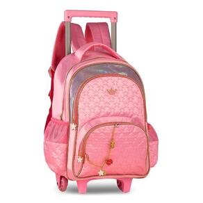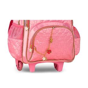 Características mochila: - mochila confeccionada em cetim com frente em pvc. - amplo espaço interno para acomodar todos seus pertences e materiais escolares. - fechamento principal com zíper e amplo bolso frontal com fechamento em zíper para carregar objetos de fácil acesso. - alça de mão resistente e acolchoada e alças de ombro super confortáveis acolchoadas com ajuste de tamanho. - possui 2 bolsos laterais para que você possa levar uma garrafa de água ou algum objeto para fácil acesso. - zíperes são em metal com detalhe em estrelas com glitters. - possui 3 bolsos. - duas rodinhas de silicone. - haste para puxar. - material: poliéster e pvc.