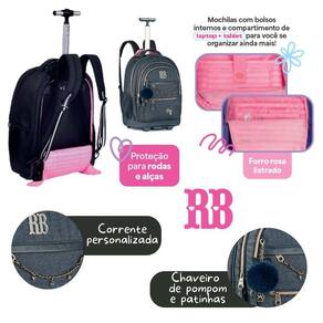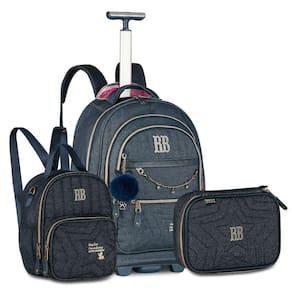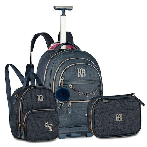 Um kit versátil e sofisticado para brilhar na escola A mochila de rodinhas RB27023, confeccionada em jeans com detalhes em ouro velho, é espaçosa, organizada e prática, com divisórias para notebook e tablet, quatro bolsos frontais, bolsos laterais e opção de uso no carrinho ou nas costas, com proteção de rodas e alças acolchoadas. Vem acompanhada de chaveiro de pompom com orelhinhas, correntinha com strass e cartela de adesivos exclusivos. Dimensões: 48x35x19cm. A lancheira RB27028 é térmica e 2 em 1: pode ser Utilizado como lancheira tradicional, transversal ou até como mochilinha nas costas. Possui bolso frontal menor, bolsos telados laterais e muito espaço para armazenar os lanches. Dimensões: 27x20x12cm. O estojo box RB27026 traz organização extra com seus 36 elásticos, estojo interno com zíper e capacidade para até 100 lápis ou canetas. Dimensões: 22x16x6cm. Marca: Não Informado