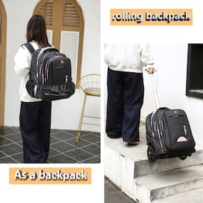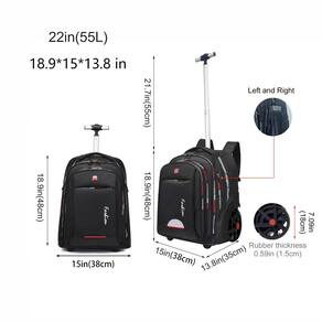 Especificações da mochila de rodas: Dimensões: Capacidade: Cerca de 55L Peso: 3,3 kg (7,28 lb) Tamanho máximo do laptop: 15,6 polegadas Tamanho: 18,9 x 13,8 x 15 polegadas Roda grande "Plus": importação, adicione bolsas de malha embutidas em ambos os lados para guardar garrafas de água, guarda-chuvas, etc; Viajar e subir escadas são mais convenientes. Tamanho da roda: 18 cm (7 pol.) Versatilidade: 4 maneiras diferentes de carregar: Mochila para transporte casual com as mãos livres, rolamento suave para viagens sem esforço, alça de transporte para viagens curtas discretas, parte superior da bolsa de mão para viagens rápidas pelo aeroporto. ECONOMIA DE TEMPO E PODER SUPERIORS: mobilidade e manobrabilidade cortesia de nossas rodas grandes, econômicas de espaço e terrenos difíceis. EFICIÊNCIA: Precisamos do que precisamos quando precisamos. Então, projetamos bolsos individuais de acesso rápido separados para um laptop, um tablet, um smartphone, uma garrafa de água e ferramentas de mesa. Segurança e detalhes: o refletor deixa você visível, viajando com segurança à noite. O chaveiro removível permite que você nunca perca suas chaves novamente e abra todas as portas convenientemente. - Escalada fácil com rodas grandes de 7 polegadas: a mochila com rodinhas tem uma roda grande de 18 cm mais larga, estável, carga pesada, economiza trabalho e tempo, fácil de passar pelos corredores e escadas do avião, não se preocupe com as rodas viradas para o lado, também não se preocupe com o desgaste da mochila. - [Espaço de grande capacidade de 55 litros] O tamanho grande da mochila com rodinhas é de 50 x 37 x 33 cm. O compartimento acolchoado para laptop com capa de fecho aderente - 24,5 x 27 x 4 cm comporta até 15,6 polegadas 15 polegadas e 15 polegadas e 1,57 pol. Laptop de 4 polegadas. O compartimento principal grande tem 55 L, comporta 58 livros, roupas, documentos e pastas. A mochila com rodinhas cabe em tudo, contém todos os tipos de livros, arquivos, canetas, computadores, iPhones, chaves, iPads, carteiras e alguns pequenos equipamentos com espaço de sobra. - Alça de ombro e alças mais fortes: as alças de ombro e alças da mochila com rodas foram reforçadas para se tornarem uma almofada de esponja muito firme e macia, mais conforto e mais suporte de carga. Design exclusivo, zíperes permitem que você use a fechadura. A mochila resistente à água protege seus eletrônicos e papéis. Serve para negócios, viagens e assim por diante; o design de tira de segurança refletiva pode ser seguro à noite. É especialmente adequada para uso em cidades chuvosas e transporte entre cidades. - Alça de ombro oculto e suporte de capa de roda ABS de liga de alumínio para telescópio: a mochila de transporte tem alça de material ABS, melhor com o tempo, não se preocupe mais com a alça não fechar; a mochila de rodinhas para adultos tem uma capa de roda, portanto não manchará suas roupas. Nossa mochila com rodas está equipada com alças ajustáveis, ergonômicas e confortáveis. O painel traseiro espesso acolchoado adiciona suporte ao usar como uma mochila de viagem. Alça de ombro escondida fácil de mover entre as cidades. - SERVIÇO DE ALTA QUALIDADE: Prometemos fornecer serviço de devolução e substituição em 30 dias. Se você tiver alguma dúvida sobre o produto, sinta-se à vontade para entrar em contato conosco por e-mail e forneceremos uma resposta satisfatória. Agora prepare uma ótima mochila para você! - NOTA: As rodas foram atualizadas de prata para preto, conforme mostrado nos desenhos principais e de tamanho. Atualmente, as rodas pretas são mais duráveis e podem ser substituídas (se houver um problema com as rodas dentro de um mês, a mochila será substituída gratuitamente; substituição de roda vitalícia).
