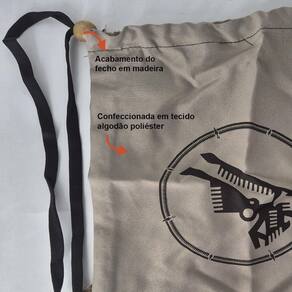 Confeccionada em tecidoalgodão poliéster eacabamento do fecho emmadeirapassante reforçadoem lona com argolade metal.