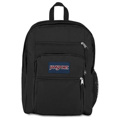 Mochila sem roda Jansport Big Student preta 47JK 008 Dois espaçosos compartimentos principais. Alças ergonômicas S-curve. Bolso frontal com divisórias. Painel traseiro almofadado. Bolso lateral para garrafa de água.
