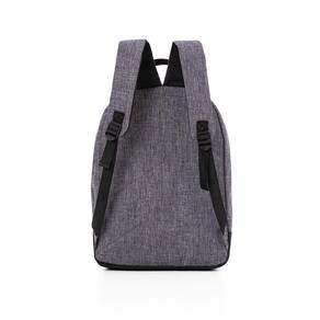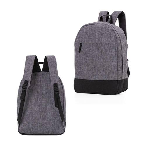 Mochila para notebook em tecido poliéster com bolso frontal com zíper e alça de mão e ombro.