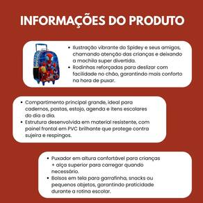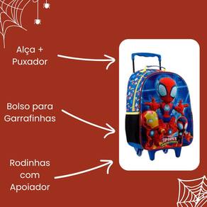 1 Bolso Principal e 2 Laterais para garrafinhas; Mochila de rodinhas e puxador resistente; Estampa Personalizada Spidey Amazing Friends;