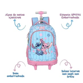 Mochila Rodas Stitch e Angel Meninas Disney Kids Escolar - Luxcel A mochila perfeita para encantar as crianças no dia a dia escolar Com estampa divertida do personagem Stitch, da Disney, ela combina estilo e praticidade. Possui compartimento principal espaçoso para livros e cadernos, bolsos laterais ideais para garrafinhas e alças ajustáveis acolchoadas que garantem maior conforto. Fabricada em material resistente e fácil de limpar, é ideal para acompanhar a rotina escolar e também passeios. Características Mochila: - Pega de Transporte Manual - Bolso Lateral Telado Mesh com brilho - Bolso Frontal Utilitário com estampa - Zíper com Puxadores Personalizados - Etiqueta UP4YOU Emborrachada - Base Emborrachada - Chaveiro Personalizado Especificações Mochila: - Marca: Luxcel - Material: 100% Poliéster - Forro: Poliéster - Medidas Aprox. axlxp : 45cm x 34cm x 18cm - Tema: Stitch e Angel - Cores: Rosa e Pink - Capacidade Aprox. litros : 27 litros - Polegadas da mochila: 18 Conteúdo da Embalagem: Mc50102sc - 1x Mochila de Rodas Stitch Disney As cores podem variar entre as imagens mostradas acima e o produto. Imagens meramente ilustrativas. Todas as informações divulgadas são de responsabilidade exclusiva do fabricante. de 90 dias contra defeito de fabricação Marca: Não Informado Ean: 7895431650411