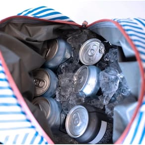 Mochila Térmica Isolada CleverMade - Mochila térmica à prova de vazamentos para 18 latas com abridor de garrafas, bolso externo com zíper e bolsos laterais em mesh para almoço, trabalho, piquenique e camping - Azul Listrada