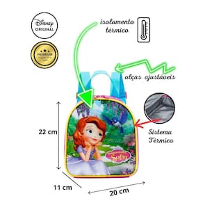 A Lancheira Térmica Escolar Princesinha Sofia Disney é o acessório perfeito para a criançada levar sua comida e bebida para a escola de forma prática e estilizada. Produzida em poliéster resistente, ela conta com alças de costas ajustáveis, proporcionando conforto durante o transporte.