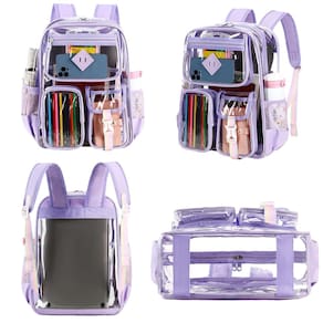 Mochila transparente roxa - ?Material?As mochilas transparentes para escola são feitas de material de PVC espesso de 0,5 mm de alta qualidade, o que a torna durável e duradoura. O material espesso é impermeável e anticongelante, e uma variedade de cores estão disponíveis (como roxo, rosa, verde, preto). - ?Alças de ombro confortáveis?A mochila transparente é projetada com alças acolchoadas que proporcionam conforto e suporte, mesmo ao transportar cargas pesadas. Ela também tem uma alça resistente na parte superior, facilitando o transporte. O pacote inclui: 1 mochila escolar transparente, 1 bolsa de lápis transparente. - ?Design transparente?A mochila transparente aprovada para estádios de segurança é feita de material transparente, permitindo fácil visualização de todo o conteúdo. Isso é particularmente útil em ambientes como campi universitários, locais de trabalho e eventos públicos onde verificações de segurança são comuns. - ?Vários bolsos?A mochila transparente inclui vários bolsos para ajudar a organizar seus pertences. Estes podem incluir compartimentos principais para itens maiores, como livros, pode acomodar laptops de 16 polegadas, bem como bolsos menores para canetas, chaves e outros acessórios. Tamanho: 41,92 cm A x 16,69 cm L x 33,77 cm C; Peso: 770 g. - ?Ocasiões?: a mochila transparente resistente é adequada para muitas ocasiões, como universidade, local de trabalho, shows, aeroporto, eventos esportivos, eventos ao ar livre, caminhadas, acampamento, praias. A mochila transparente atende totalmente aos requisitos de inspeção de segurança de universidades e locais de trabalho. Dá a você a conveniência de verificar se tudo o que você precisa está pronto e oferece acesso rápido aos seus pertences. - ?Idade de aplicação?: Idade 5-25 anos. A mochila transparente aprovada pelo estádio é perfeita para meninos, meninas e homens.