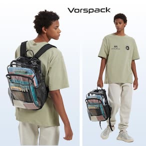 Vorspack Mochila transparente resistente. Você precisa de uma mochila de estádio transparente para uso diário? Aqui está nossa mochila resistente que combina funcional e elegante. Tamanho 47 x 35,5 x 23 cm, a mochila traseira transparente com design transparente, o que a torna perfeita para o trabalho, faculdade, viagens, shows, festivais, academia, aeroporto e esportes. Nossa mochila de plástico transparente possui compartimentos multifuncionais, incluindo um compartimento principal para livros, fichários e laptops, um bolso com zíper para itens essenciais, um bolso frontal grande com uma bolsa para blocos de notas e quatro bolsas pequenas para canetas. O material durável de PVC de 0,5 mm garante a mochila transparente para uso duradouro e é fácil de limpar, enquanto a parte inferior de tecido reforçado e as alças acolchoadas adicionam força e conforto extra. Perfeito para aniversários, Natal, Halloween, Carnaval e Ano Novo. Observação: a bolsa transparente não é aprovada pelo estádio. - Mochila transparente extragrande: Tamanho 47 x 35 x 23 cm, com vários compartimentos para armazenamento. Adequada para faculdade e trabalho, nossa mochila transparente resistente permite verificações rápidas e fácil acesso com seu design transparente - Design com vários bolsos: esta mochila transparente tem um compartimento principal que comporta fichários, laptops e livros, enquanto um bolso com zíper mantém sua carteira e chaves seguras. Bolso frontal grande, com uma bolsa grande para blocos de notas e 4 bolsas pequenas para canetas e uma calculadora. Além disso, a mochila transparente tem 2 bolsos laterais para garrafas de água e guarda-chuvas - PVC mais espesso e resistente: feitas de material de PVC mais espesso de 0,5 mm sem cheiro, nossas mochilas transparentes para adultos são feitas para suportar o uso diário. Nossas mochilas transparentes são duráveis, macias e flexíveis, permitindo que você as dobre e modele conforme necessário - Parte inferior aprimorada e alças acolchoadas: a parte inferior da mochila de plástico foi reforçada com poliéster grosso e pontos reforçados para maior durabilidade. As alças acolchoadas da bolsa transparente para laptop ajudam a aliviar o desconforto no ombro e melhoram o conforto durante o uso - Perfeita para qualquer ocasião: seja para o local de trabalho, um festival ou qualquer evento que exija uma bolsa transparente grande, escolha nossa mochila resistente transparente. Não é apenas conveniente para o uso diário, mas também uma ótima opção para o Natal, Ação de Graças e aniversários para homens e mulheres