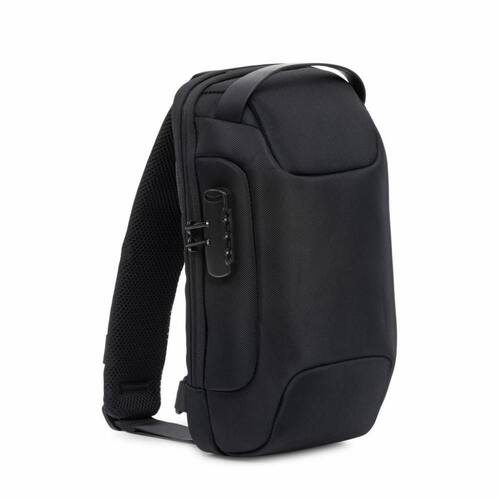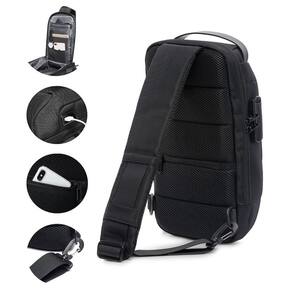 O acessório possui um cadeado com senha de três dígitos que trava a abertura da mochila para mantê-la inviolável. Na parte traseira há um bolso oculto onde o usuário pode colocar o celular, a carteira ou uma agenda. Além de abertura 180, a Mochila possui na alça a regulagem de tamanho e a fivela de gancho possibilita a mudança de lado para adequar a melhor forma de uso. Possui duas entradas na lateral (USB e Micro USB V8) para plugar dispositivos, e com essa ferramenta o usuário pode carregar um smartphone sem nececidade de ter ficar segurando o carregador! (carregador portátil não incluso).