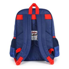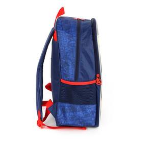 Fabricada em poliéster e pvc , possui alças de costas acolchoadas com regulagens, alça de mão, bolsos laterais em redes elásticas, 2 bolsos superiores com fechamento em zíper de metal personalizados, etiqueta personalizada em bolso plástico na parte de trás e acolchoado na parte de trás da mochila para as costas da criança.