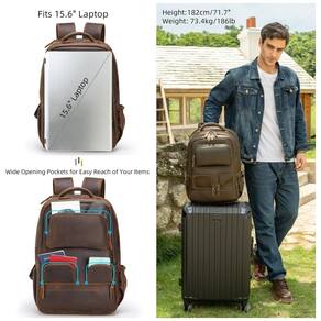 Almofada ergonômica e alça de bagagem A parte de trás da mochila de couro é feita de acolchoamento macio e respirável, cujo design côncavo e convexo está em conformidade com a ergonomia, à prova de suor, confortável e também com equilíbrio de peso para reduzir a carga de transporte. A alça de bagagem pode segurar a mochila em uma mala que pode facilitar sua viagem. Dimensões da mochila 32 x 16 x , pesos 2kg , 4,5lbs, alças ajustáveis 52 , largura dos ombros .