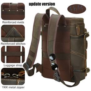 Versão de atualização Com base no comentário do cliente, a mochila de couro vintage foi atualizada para zíperes YKK, que podem suportar testes de força de tração 1000 vezes, bastante duráveis. A parte traseira da mochila marrom é atualizada para espaçador de malha, respirável e confortável, além de evitar manchas na roupa. O cinto antiderrapante para alças de ombro mantém o equilíbrio do peso para aliviar a fadiga da carga. Um cinto de bagagem para colocar esta mochila de viagem na mala para facilitar sua viagem. Um chaveiro , cordão é adicionado.