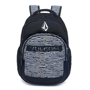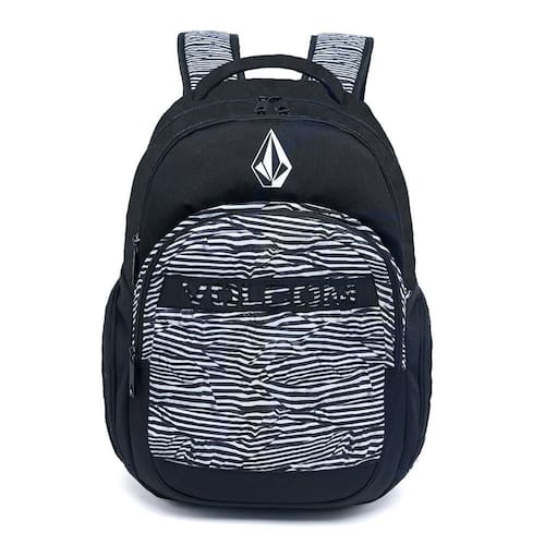 Mochila Volcom com compartimento principal, compartimento frontal, compartimento para notebook até 15.6", estampa frontal e etiquetas personalizadas.