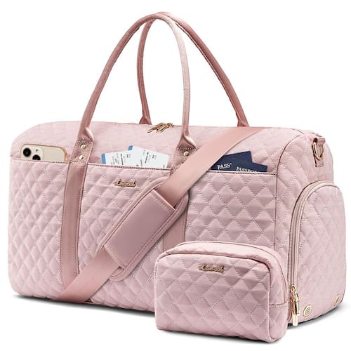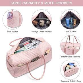 Bolsa feminina de fim de semana - ?Bolsa de viagem com compartimento para sapatos + bolsa de banheiro separada ?Esta bolsa de viagem para mulheres vem com uma bolsa de higiene pessoal de US$ 15 e um compartimento separado para sapatos. Mantenha seus sapatos e roupas sujas separados do resto de seus itens com um compartimento ventilado que dispersa odores ruins. É a bolsa de viagem ideal para pernoite e fim de semana para viagens pessoais ou de negócios. - ?Bolsa de viagem de avião? Tamanhos - 54,5 x 23 x 31,5 cm, 1 kg. esta bolsa de mão para aviões atende à maioria dos requisitos internacionais de bagagem de mão. Cabe perfeitamente no compartimento superior e sob o assento como um item pessoal durante o seu voo. A capa de carrinho integrada desliza sobre a alça da bagagem para facilitar a viagem no aeroporto. Um bolso traseiro com zíper guarda seu smartphone, identidade ou passaporte. - ?Bolsa de fim de semana de atualização de capacidade?Esta bolsa esportiva para viagens é perfeita para uma viagem de 2 a 3 dias. Com vários bolsos, incluindo uma bolsa úmida grande com zíper e quatro bolsos laterais externos, é fácil guardar todos os itens essenciais da academia, ioga e viagens. Também pode ser usada como bolsa hospitalar, bolsa para mamãe ou bolsa médica. - ?Bolsa de ginástica separada e úmida?Esta bolsa feminina de ginástica tem um bolso forrado de PVC à prova d'água que separa itens molhados e secos, como roupas, toalhas e roupas de banho. É a companhia perfeita para esportes ao ar livre e internos, como exercícios, ioga, tênis, acampamento, praia e natação. Também é um presente atencioso para aniversários, Ação de Graças e Natal. - ?Bolsa esportiva multiuso e garantia de satisfação?Use-a como uma bolsa esportiva de viagem, bolsa de fim de semana para mulheres, bolsa noturna para mulheres, bolsa de mamãe para hospital, bolsa de viagem para mulheres de viagem, bolsa esportiva feminina ou bolsa para laptop.