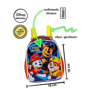 A estampa da mochila é estilizada e traz os personagens da Patrulha Canina, garantindo um visual divertido e animado. Suas dimensões são de 42 x 30 x 15 cm altura x largura x profundidade .