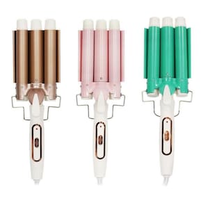 Tubo triplo profissional Hair Wave Curler para rodas. Voltagem: 110v - 220v. Frequência: 50Hz. Cabo não rotativo, mas fácil de enrolar. Máquina profissional para fazer cachos. Recomendado para uso doméstico. Material dos barris: cerâmica. Diâmetro do cano: 25mm. Quantidade do barril: 3. Indicador de luz LED\ NConteúdo da embalagem: 1 x onda de cabelo de barril triplo