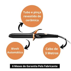 O modelador Taiff Curves 32mm 1 1/4 210°C BIVOLT é um aparelho de modelagem de cabelos que permite criar cachos com efeito ondulado ou cacheado. Ele tem um tubo de cerâmica com diâmetro de 32mm, que garante um aquecimento uniforme e evita danos aos fios. O modelador também possui um cabo giratório de 3 metros, que facilita o manuseio.