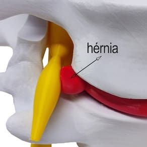 Modelo anatômico detalhado representando a hérnia de disco na coluna lombar.