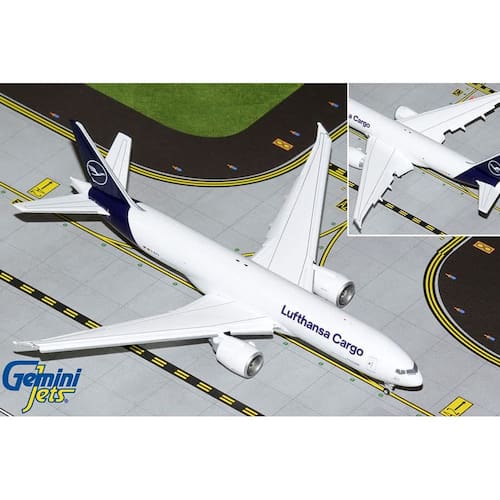 Aeronave comercial Boeing 777F da GeminiJets com abas para baixo Lufthansa Cargo branca com cauda azul escura, modelo 1/400, modelo fundido sob pressão