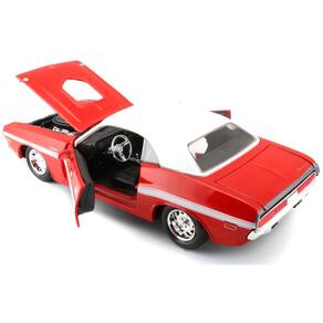 1970 Dodge Challenger R/T Coupe vermelho com parte superior branca e listras brancas 1/24 modelo de carro fundido por Maisto