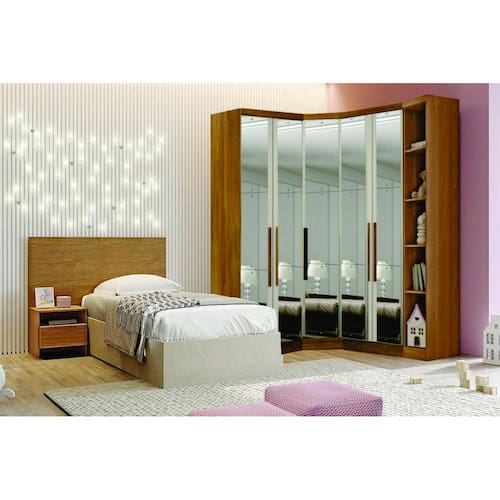 Modulado Closet Completo Espelhado 5 Portas 6 Gavetas - Rizon - Móveis Novo HorizonteO Modulado Solteiro Rizon possui um excelente padrão de qualidade combinando com qualquer ambiente, agregando beleza e sofisticação. Possui vários compartimentos, espaço para peças penduradas e dobradas, além de nichos que podem acomodar bolsas, roupas de camas, sapatos, brinquedos, decorações e o que mais você precisar para um dia a dia mais prático. Super versátil e elegante, encaixando perfeitamente no seu espaço. Confira e aproveite!Faz parte do anúncio:1 Módulo Cantoneira1 Módulo Canto Oblíquio2 Módulos 2 Portas 3 GavetasObs: Objetos de decoração, cama e colchão não acompanham o produto.Particularidades do Modulado:Características:- 100% MDF- Excelente espaço interno