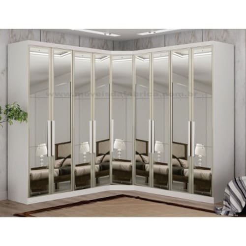 Modulado Moderno Espelhado 9 Portas 6 Gavetas - Linea-Branco - Móveis Novo Horizonte   O Modulado Closet Linea irá mudar o visual do seu quarto, com suas portas espelhadas incríveis, um bom número de compartimentos, espaço para pendurar roupas longas, além de nichos e várias prateleiras que podem acomodar bolsas, roupas de camas, sapatos e o que mais você precisar para um dia a dia mais prático. Ainda conta com 6 gavetas espaçosas com corrediças telescópicas e 8 cabideiros. Perfeito, não é mesmo? Aproveite!   Faz parte do anúncio: 2 Módulos 4 Portas 3 Gavetas 1 Módulo Canto Oblíquio Obs: Objetos de decoração não acompanham o produto.   Particularidades do Modulado: Características: - 100% MDF - Excelente espaço interno - 27 espelhos, sendo 3 por porta - 12 prateleiras internas - 6 gavetas com corrediças telescópicas - 8 cabideiros de alumínio - Dobradiças de pressão 35mm   Dimensão Total: Altura: 2,36 metros Largura: 2,44x2,44 metros   Dimensões Módulo 4 Portas: Altura 2,36 metros Largura 1,59 metros Profundidade: 56,5 centímetros   Dimensões Módulo Canto Oblíquio: Altura 2,36 metros Largura 82,7 centímetros Profundidade: 69,5 centímetros   FIQUE ATENTO: Verifique se as medidas disponíveis do seu espaço são compatíveis com as medidas do modulado.   Informações Importantes:. - O envio desse produto é feito através de transportadora. - Produtos podem apresentar diferenças de tonalidades entre a foto na tela e o produto real, devido a calibração de cor de tela.  - Limpar com flanela ou pano macio. Não utilizar álcool. Não utilizar produtos abrasivos ou corrosivos. - Nós prezamos pela qualidade da entrega em primeiro lugar, trabalhamos com transportadoras altamente selecionadas e os melhores materiais de embalagem. - A montagem é de total responsabilidade do comprador. Antes de comprar, verifique o espaço disponível para a montagem. - Certifique-se de que o produto caiba em elevadores e vãos de escadas, não fazemos içamentos. Quaisquer despesas deste tipo ficam a cargo do cliente - Garantia de 3 meses contra defeitos de fabricação.