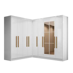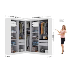 Esta modulação conta com um Canto Paris 4 portas e um Paris 4 portas, ambos com amplo espaço interno, muito bem distribuído com prateleiras para melhor aproveitamento, cabideiro em madeira e uma estrutura versátil que acomoda roupas longas.
