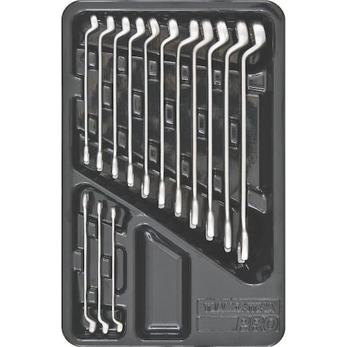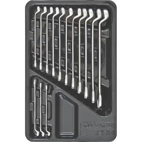 Bandeja em plástico termoformado. As chaves de aperto são produzidas em aço ligado com cromo vanádio (Cr-V), e apos submetidas a testes rigorosos de torque para atender a norma DIN 1711-1. O novo perfil Hyper Drive, em alguns modelos de boca tipo estrela, reduz a fadiga das chaves, prolongando sua vida útil. O teste de dureza é realizado em vários pontos para assegurar a resistência ao desgaste da chave durante o uso ininterrupto. Alguns tipos de chaves de aperto são fornecidos em bitolas métricas e em polegadas, para os diversos fixadores disponíveis. Afrouxar e apertar parafusos e porcas sextavadas e quadradas. As ferramentas são produzidas e testadas conforme normas específicas.