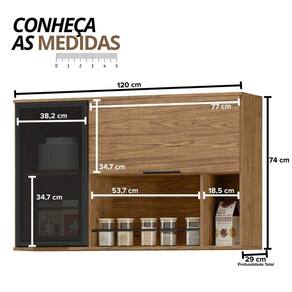Com 120cm, ele combina uma vitrine de vidro fumê, uma porta basculante com pistão a gás e nichos práticos com porta-temperos.