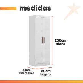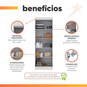 MEDIDAS: A = 200 cm L = 60 cm P = 47 cm PESO: 41,85kg PESO SUPORTADO: 112kg PRATELEIRAS SUPORTAM ATÉ: 6kg MODELO: Modulo Madrid Guarda Roupas 2 Portas 2m MARCA: Maxel MATERIAL DA ESTRUTURA: MDP ESPESSURA DO MATERIAL DA ESTRUTURA: 12mm TIPO DE PINTURA: Verniz alto brilho ACABAMENTO: Texturizado PORTAS: 2 TIPO DE PORTA: Bater DOBRADIÇAS: Metálicas PUXADOR: Plástico PRATELEIRAS: 4 PÉS: Não possui DIFERENCIAL: Amplo espaço de armazenamento, acabamento em verniz texturizado e verniz brilho nas portas, produto versátil. ITENS INCLUSOS: 1 Modulo Guarda Roupas, 1 Manual de Montagem, 1 Kit Parafusos INSTRUÇÕES E CUIDADOS: Para maior durabilidade, recomendável que a limpeza dos móveis seja feita com pano limpo e levemente umedecido em água e sabão neutro. Em seguida, deverá ser passado um pano limpo e seco GARANTIA: 3 meses