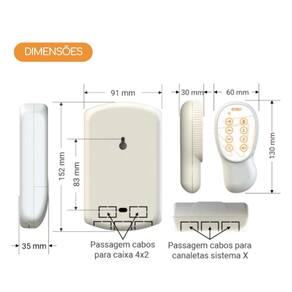 Alimentação do Módulo de Comando: Fonte 12Vcc Amperagem da Central de Comando: 7,5A Potência da Central de Comando: 90W Alimentação do Controle Remoto: Pilha CR2032 Controle Remoto com alcance de 20 metros Controle Remoto com proteção contra respingos de água Fonte de Alimentação: 12V Chaveda e Seleda de 100W