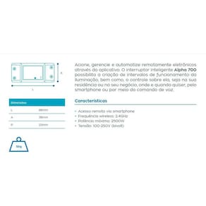 Módulo Inteligente Wifi 1 Canal 10A App Tuya Alpha700 Aitek Inteligente Wi-Fi Controlar o funcionamento dos aparelhos através de um smartphone ou tablet utilizando WiFi é um dos projetos de automação mais requisitados. Quando se fala em automação residencial, uma das primeiras coisas que vem à mente é: acionamento de lâmpadas através de WiFi. Se você procura uma solução simples, prática e de ótimo custo benefício para controlar remotamente lâmpadas e alguns equipamentos domésticos, este produto é uma excelente opção. Para tornar o seu dia a dia mais versátil, adquira o Inteligente Wi-Fi. Comando de Voz: Mãos livres para gerenciar seus dispositivos através de comandos de voz. Compatível com Google Home e Alexa da Amazon.Agendamentos: Defina os horários de funcionamento desejados.Compartilhamento: Compartilhe o controle com os membros da sua família, para aproveitar todos os recursos juntos. Controle pelo App: SmartLife ou NovaDigital. Características do Produto: Aviso Sobre o Produto: Imagem ilustrativa.Tipo: Touch Wi-Fi.Modelo: MS-101.Voltagem: 100 240V AC.Corrente Máx: 10A.Padrão Wi-Fi: IEEE 802.11 b / g / n.Frequência: 2,4GHz. Compatibilidade: Android e iOS.App do Produto: SmartLife ou NovaDigital.Material utilizado na Fabricação: Plástico ABS, Metal e Circuito eletrônico. Disponível na Cor: Branca Fabricado na China. Tens inclusos: 01 Módulo Wi-Fi de 1 Canal. Marca: Não Informado Ean: 7897748701183