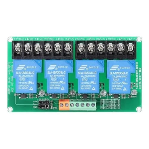 Este módulo de relé de 4 canais utiliza relés de alta qualidade com capacidade máxima de carga de 30a. O isolamento do optoacoplador garante uma capacidade de condução forte e um desempenho estável. A corrente de gatilho é de 5ma. O módulo suporta tensões de trabalho de 5v, 12v e 24v, permitindo a escolha de acordo com as necessidades do usuário.
