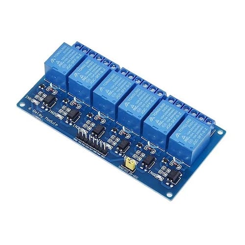 O Módulo Relé 5V de 6 Canais permite que a partir de um microcontrolador seja possível controlar cargas AC (alternada) de forma simples e prática. Por ter 6 Canais, é possível controlar até seis cargas AC de até 10A e de forma independente. Comumente é utilizado para controle de lâmpadas, ventiladores e outras saídas que possam ser acionadas através de relé.