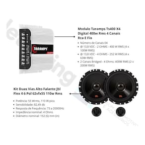 O Módulo Taramps TS400x4 Fio + Kit 2 Vias 6 JBL FLEX4 62VFX55 110 Watts Rms é um conjunto de equipamentos de áudio automotivo que proporciona uma experiência sonora de alta qualidade. O módulo Taramps oferece 400 watts RMS em 4 canais, permitindo uma personalização eficiente do sistema de som. O Kit 2 Vias JBL adiciona alto-falantes de 6 polegadas com 110 watts RMS, proporcionando reprodução de áudio nítida. Juntos, esses componentes criam um sistema completo para aprimorar o som do veículo, oferecendo desempenho superior e detalhes sonoros impressionantes. Transforme seu carro em um ambiente acústico de alta fidelidade com essa poderosa combinação.