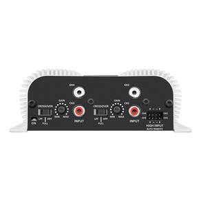 • Classe de Operação Classe D • Número de Canais 04 • Potência Máxima @ 13,8 VDC - 2 OHMS - 400 W RMS (4 x 100W RMS) @ 13,8 VDC - 4 OHMS - 252 W RMS (4 x 63W RMS) 2 Canais Bridged - 4 Ohms: 400W RMS (2 x 200W RMS) • Sensibilidade de entrada (RCA): 4V (min.) / 250mV (max.) (FIO): >10V (min.) / 3V (max.) • Relação de Sinal/Ruído >90dB • Resposta de Frequência 18Hz ~ 30KHz (-3dB) • Crossover High Pass (HPF) 90Hz (-12dB/8ª) Fixo • Crossover Low Pass (LPF) 90Hz (-12dB/8ª) Fixo • Impedância de Entrada 22K Ohms • Sistema de Proteção Curto na Saída e Térmica • Tensão de Alimentação Mínima 8VDC • Tensão de Alimentação Máxima 16VDC • Consumo em Repouso 0,8A • Consumo Máximo em Sinal Senoidal 33A • Dimensões (LXAXP) 138x49x131mm • Peso 0,65Kg