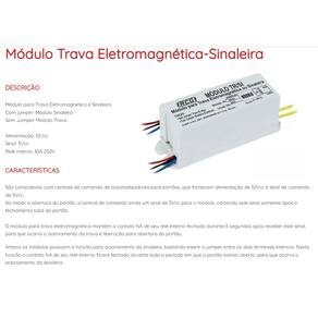 O módulo para trava eletromagnética mantém o contato NA de seu relé interno fechado durante 6 segundos após receber este sinal, para que ocorra o acionamento da trava e liberação para abertura do portão.