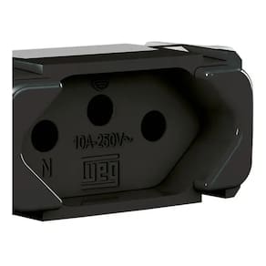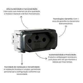 Com instalação fácil, este módulo é embutido e apresenta tamanho compacto, ocupando apenas um espaço na placa. Sua cor preta confere um visual elegante e discreto, que se adapta facilmente à decoração do ambiente. Além disso, o produto conta com 2 polos mais terra e suporta correntes de até 10A e tensões máximas de 250V.