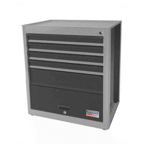 Estrutura em chapas de aço conformadas. 5 gavetas com corrediças telescópicas. 1 porta com abertura de 90. Tranca para a porta e gavetas. Pintura eletrostática. Capacidade de carga máxima gavetas com altura de 75 mm: 20 kg. Capacidade de carga máxima gavetas com altura de 155 mm: 30 kg. Espessuras das chapas do corpo e gavetas: 1.2 mm. Espessuras das chapas da porta: 0.9 mm.Utilizado para o armazenamento de ferramentas e base de trabalho para manutenção de peças.As corrediças telescópicas garantem deslizamento suave e maior abertura para as gavetas, quando comparadas com corrediças tradicionais.Com 4 pés para regulagem de altura, para compensar irregularidades no piso.Móduloversátil que permite a montagem de bancadas com layout e composições diversas.A capacidade de carga estática total depende da configuração escolhida para a bancada.Acompanha manual de instruções para auxiliar a montagem do módulo com o restanteda estrutura da bancada.Capacidade de carga e resistência da estrutura comprovadas através de testes práticos.